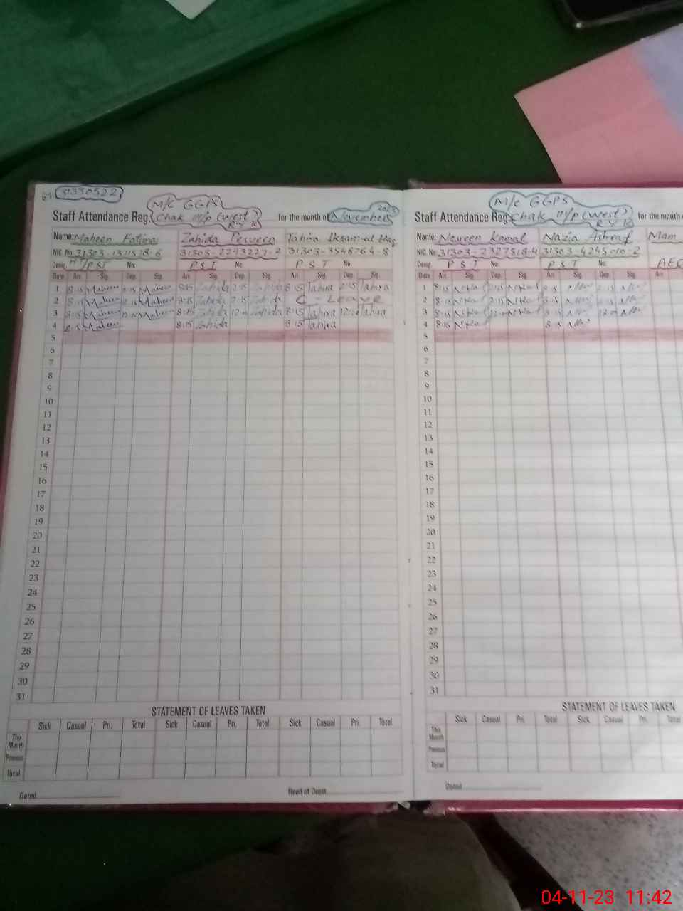 | CNIC | Full Name | Designation | R/C | Absence During Last Calender Month |