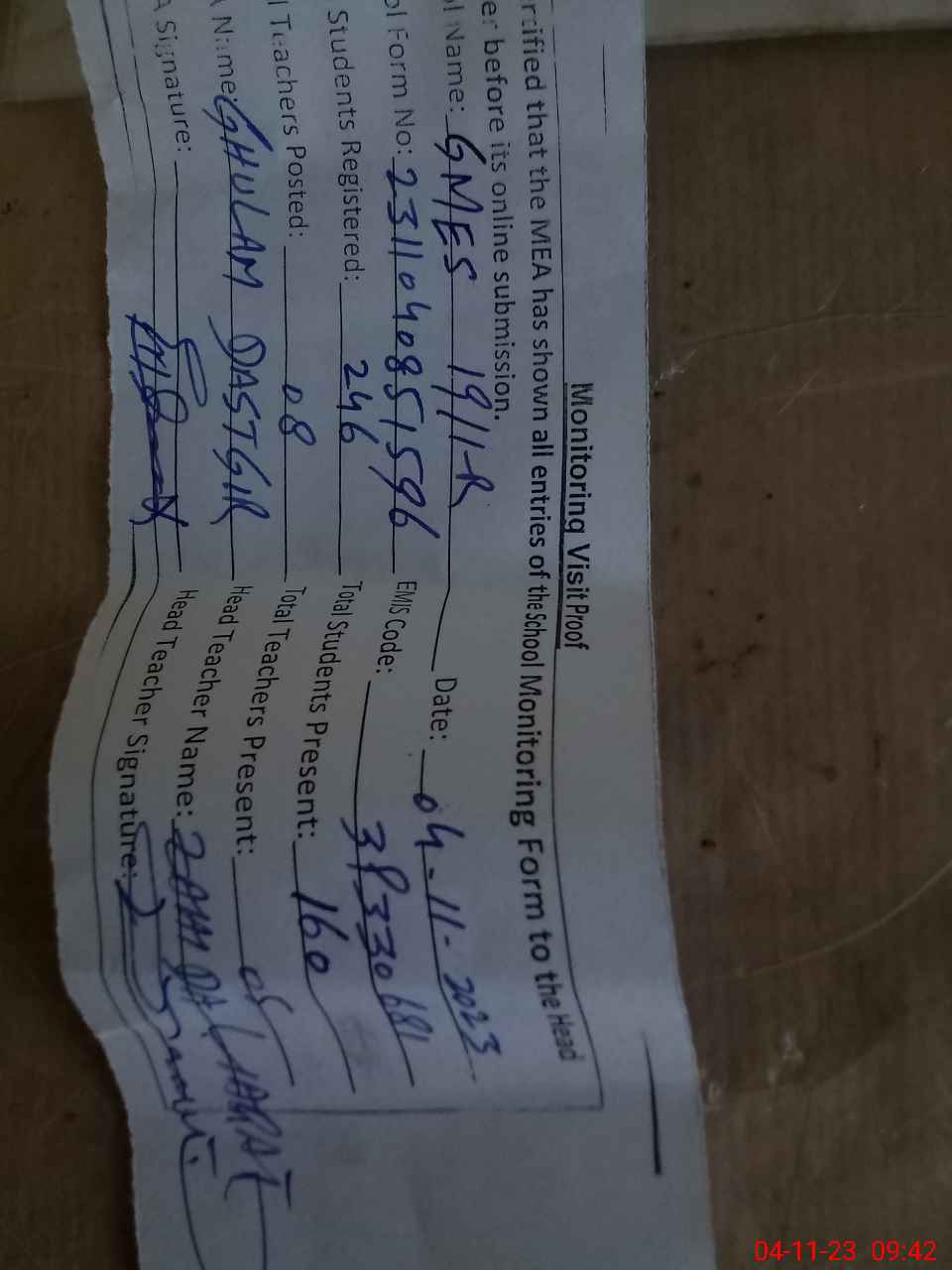 | Attendance Register | Head Teacher | MEA with School | Visit Proof |