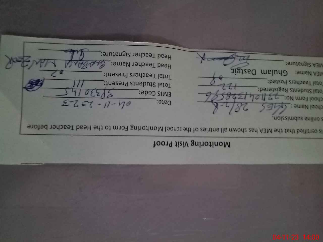 | Monitoring Date: 04-11-2023 | Start Time: 04-11-2023 01:27 PM | End Time: 04-11-2023 02:01 PM | Name of MEA: GH**** DA**** (R**** | |