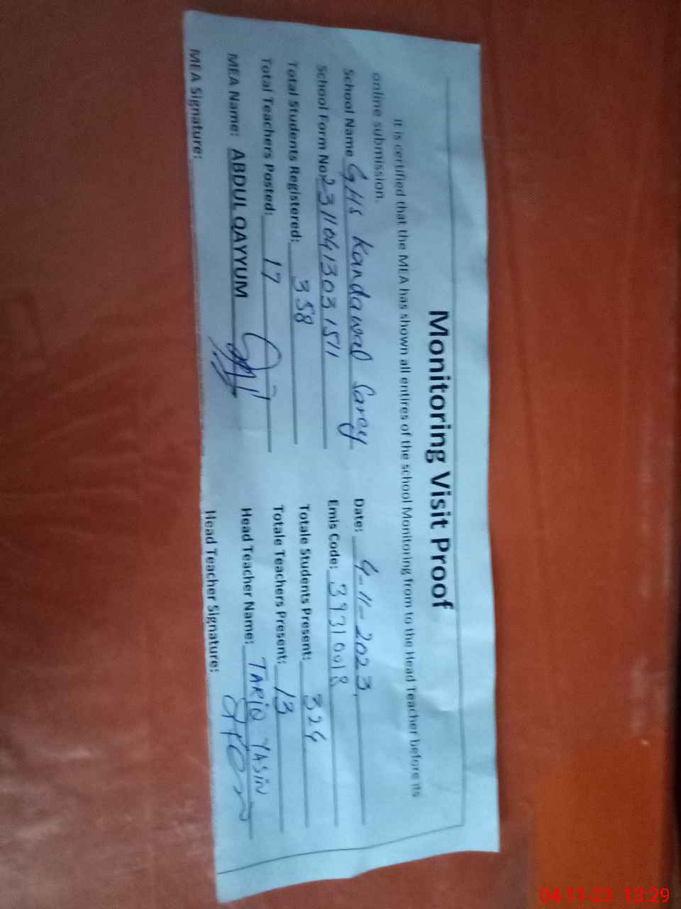 | Attendance Register | Head Teacher | MEA with School | Visit Proof |