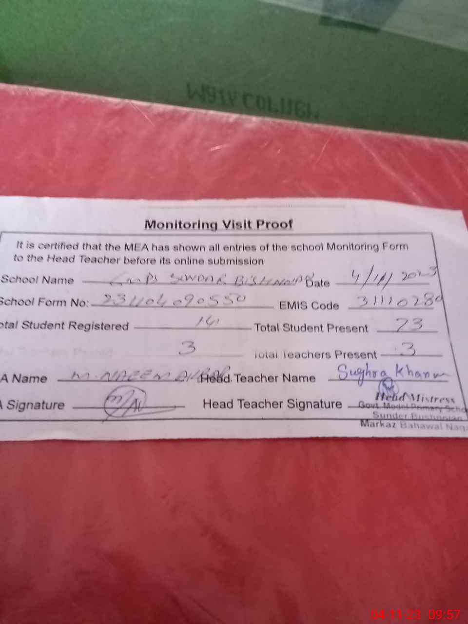 | Attendance Register | Head Teacher | MEA with School | Visit Proof |