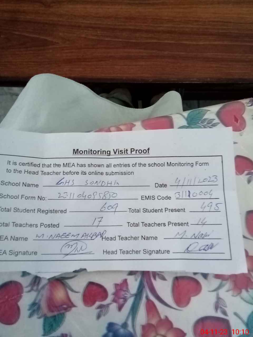 | Attendance Register | Head Teacher | MEA with School | Visit Proof |