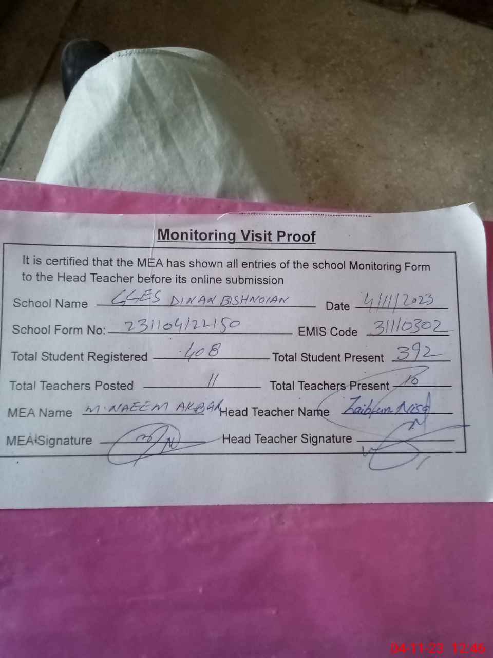 | EMIS Code: 31110302 | Name of School: GGES DINAN BISHNOIAN | |||