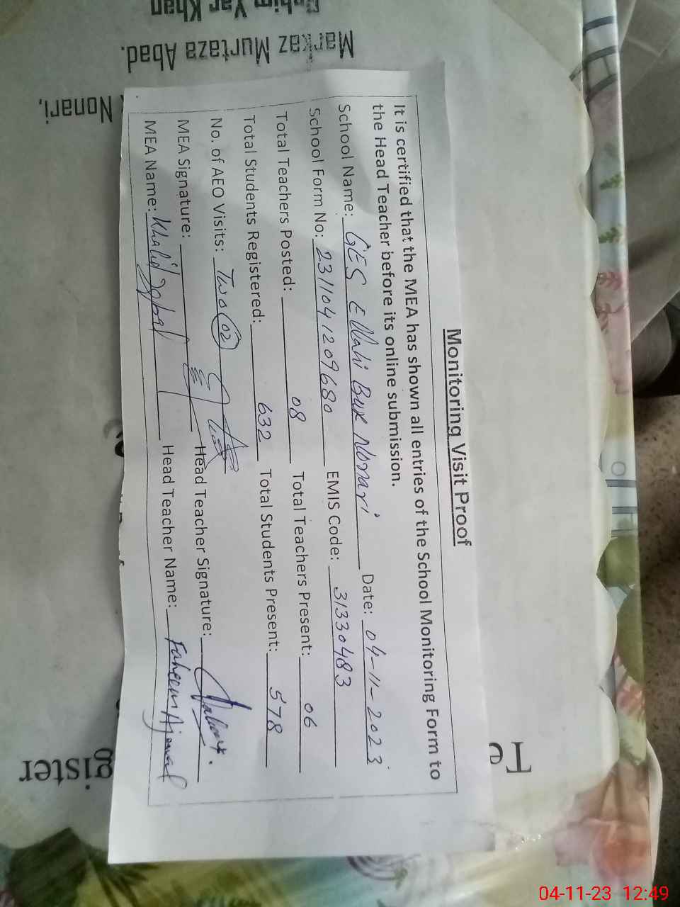 | EMIS Code: 31330483 | Name of School: GES BASTI ELAHI BUX NONARI | |||