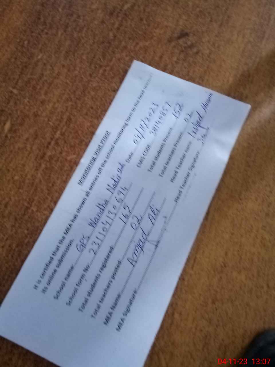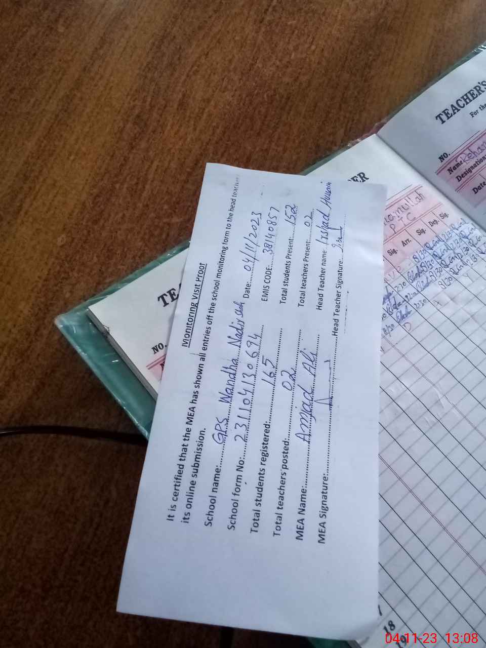 | Attendance Register | Head Teacher | MEA with School | Visit Proof |