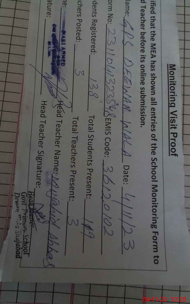| EMIS Code: 36120102 | Name of School: GPS DEEWAN WALA P/O LASURI MAOZA PUNJANI | |||