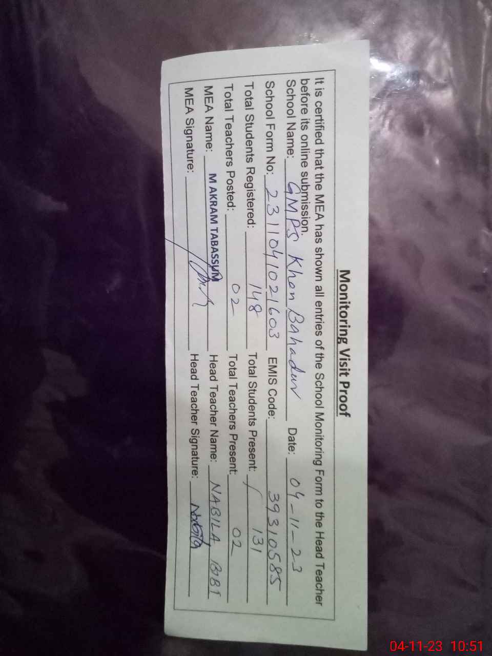 | EMIS Code: 39310585 | Name of School: GMPS KHAN BAHADAR | |||