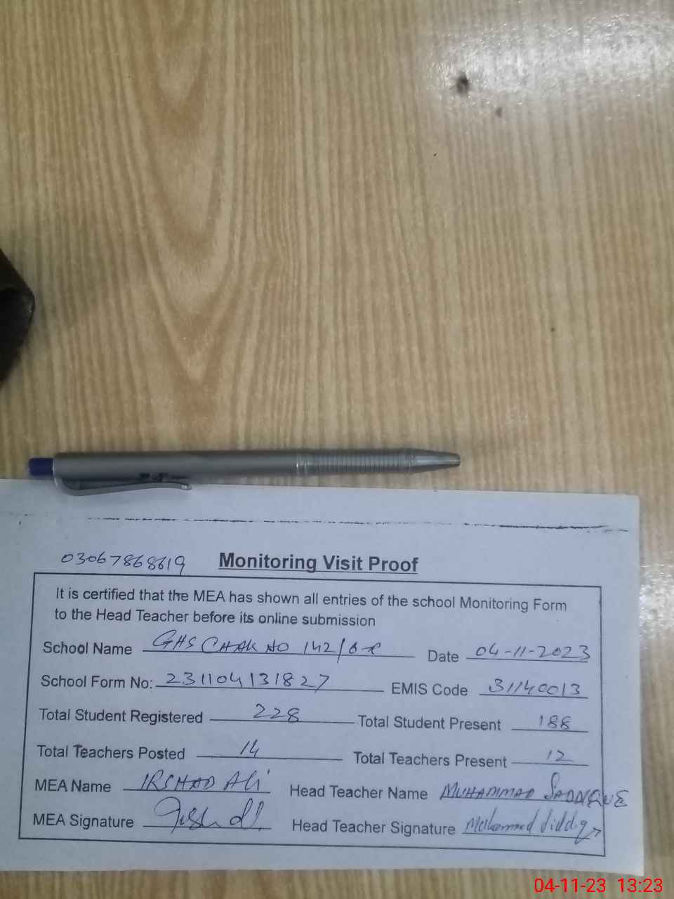 | EMIS Code: 31140013 | Name of School: GHS CHAK NO. 142/6-R | |||
