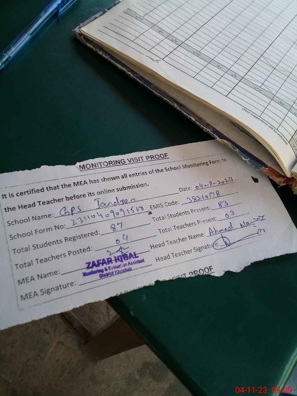 | Attendance Register | Head Teacher | MEA with School | Visit Proof |