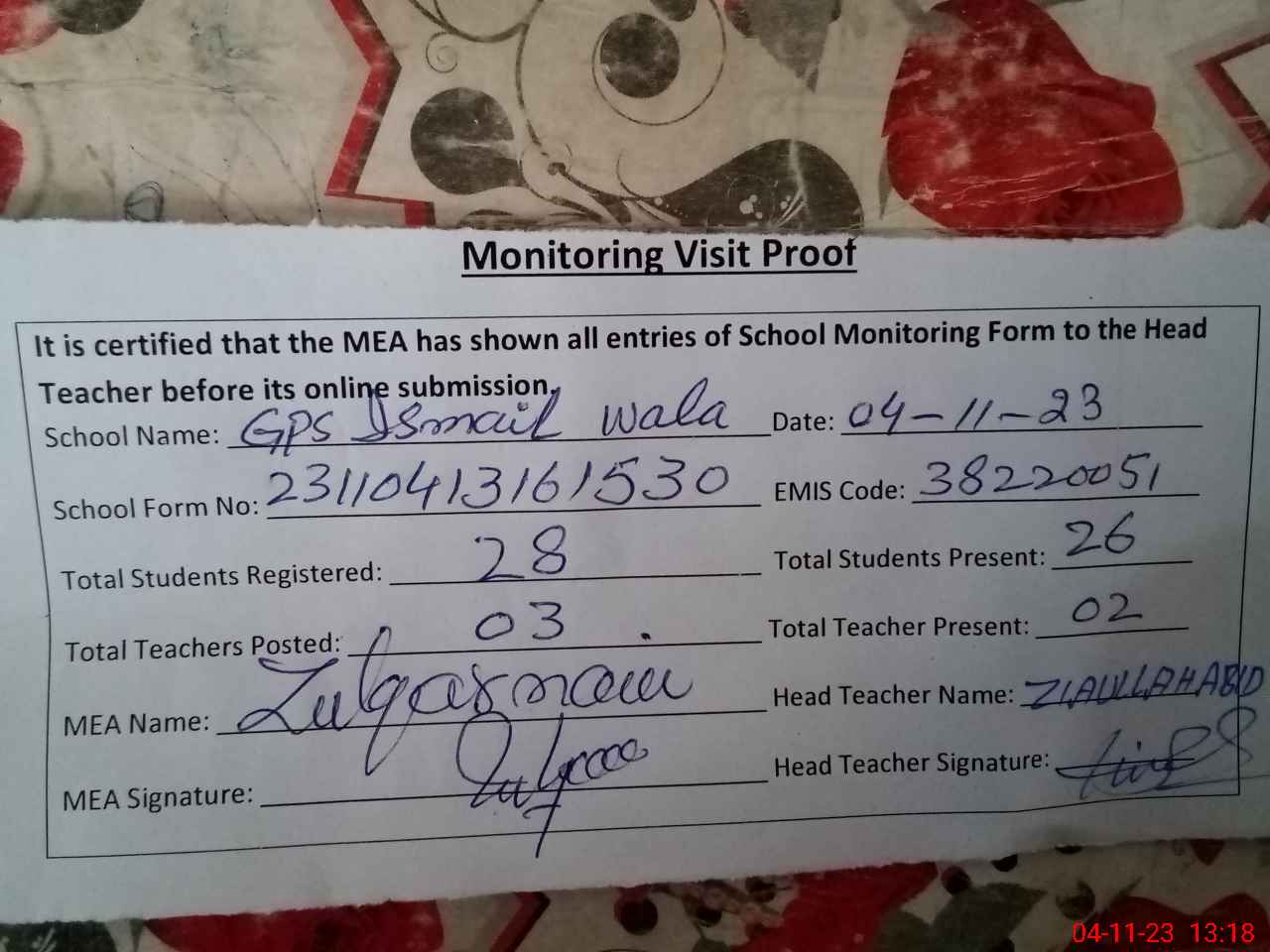 | Attendance Register | Head Teacher | MEA with School | Visit Proof |