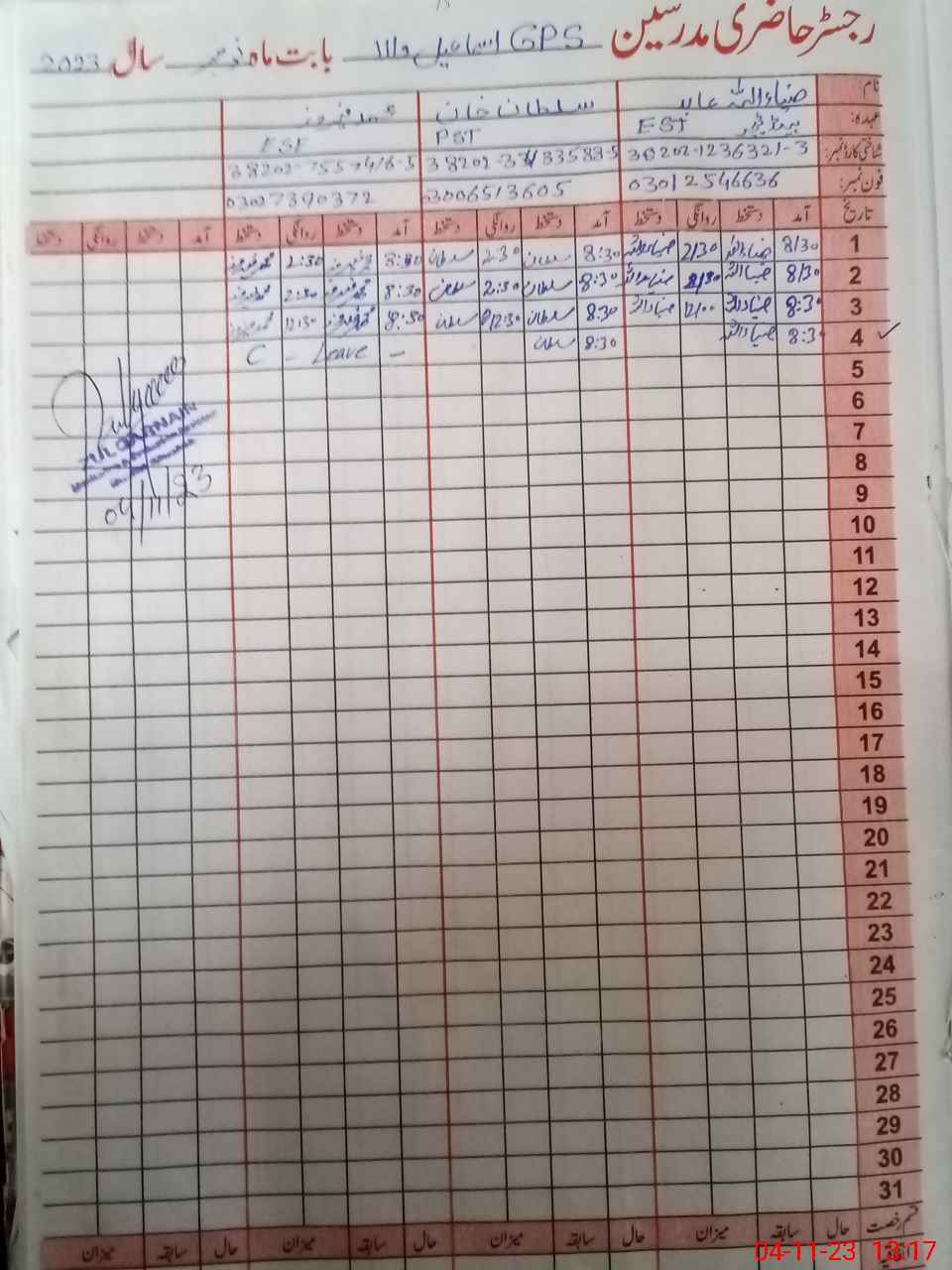 | CNIC | Full Name | Designation | R/C | Absence During Last Calender Month |