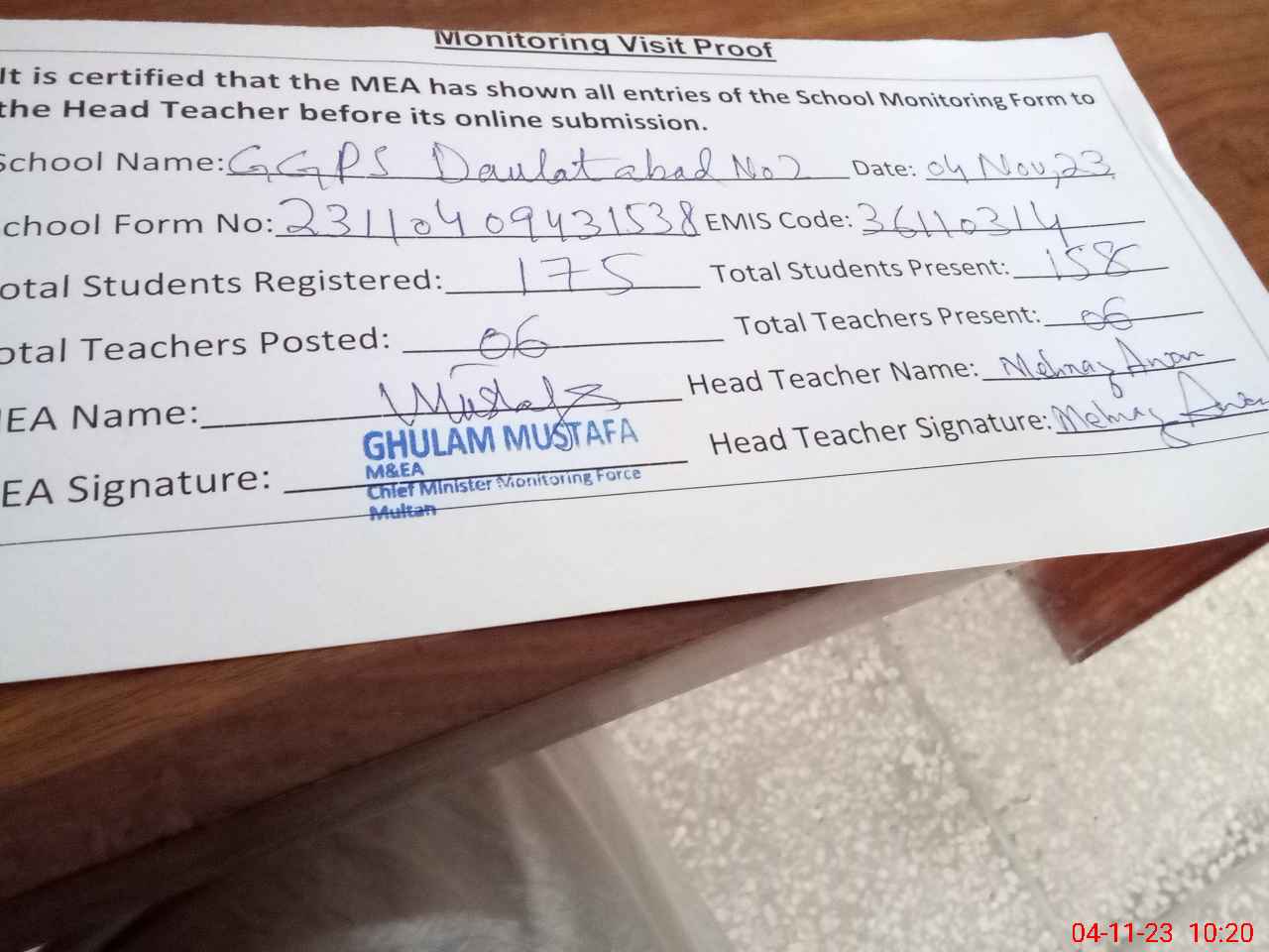 | EMIS Code: 36110314 | Name of School: GGPS DAULAT ABAD NO.2 MULTAN | |||