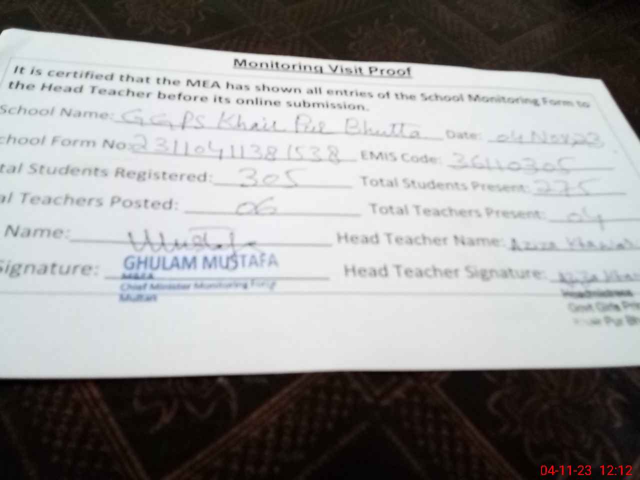 | Monitoring Date: 04-11-2023 | Start Time: 04-11-2023 11:38 AM | End Time: 04-11-2023 12:14 PM | Name of MEA: Gh**** Mu**** | |