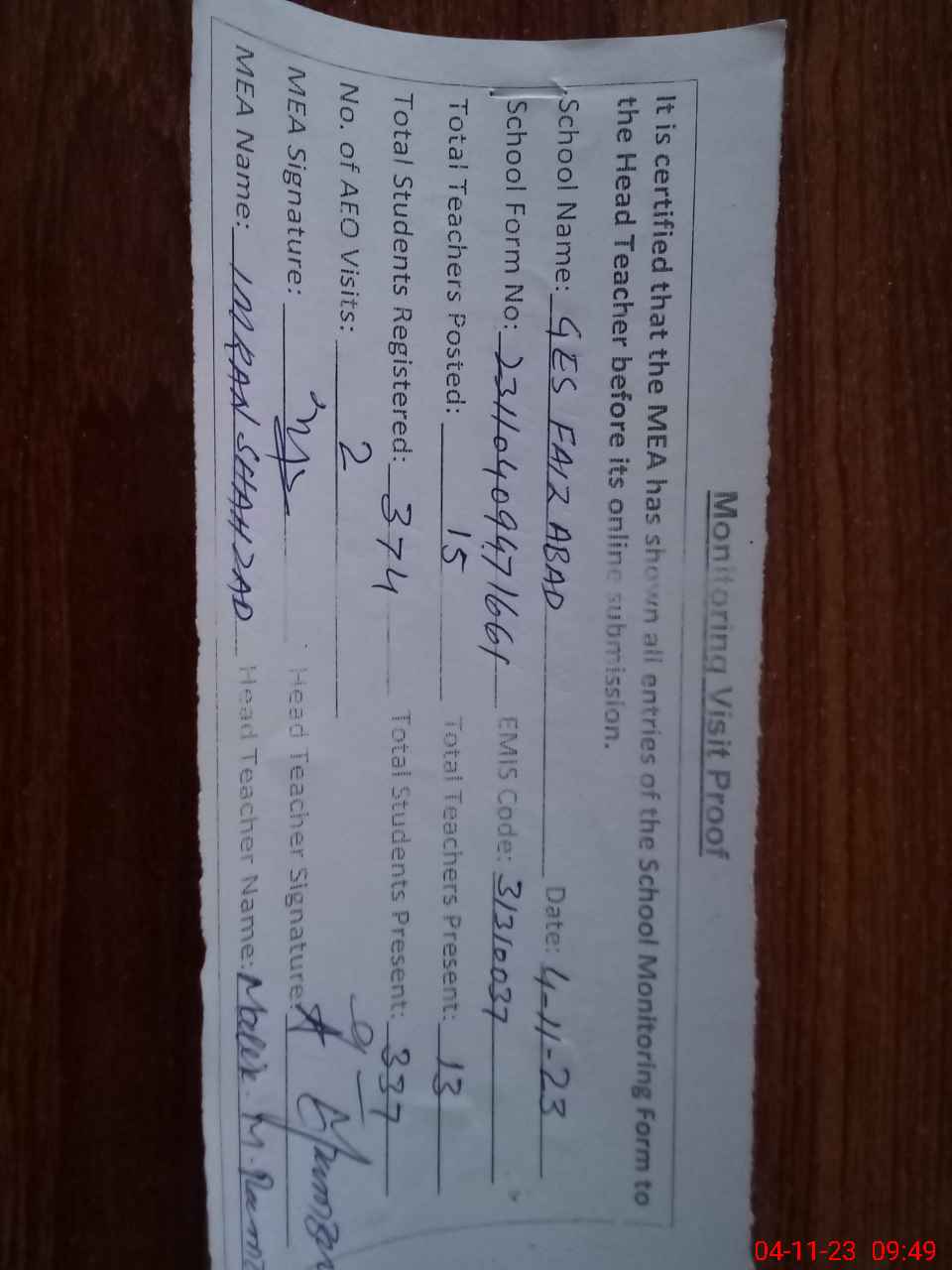 | EMIS Code: 31310037 | Name of School: GES FAIZ ABAD KHANPUR | |||