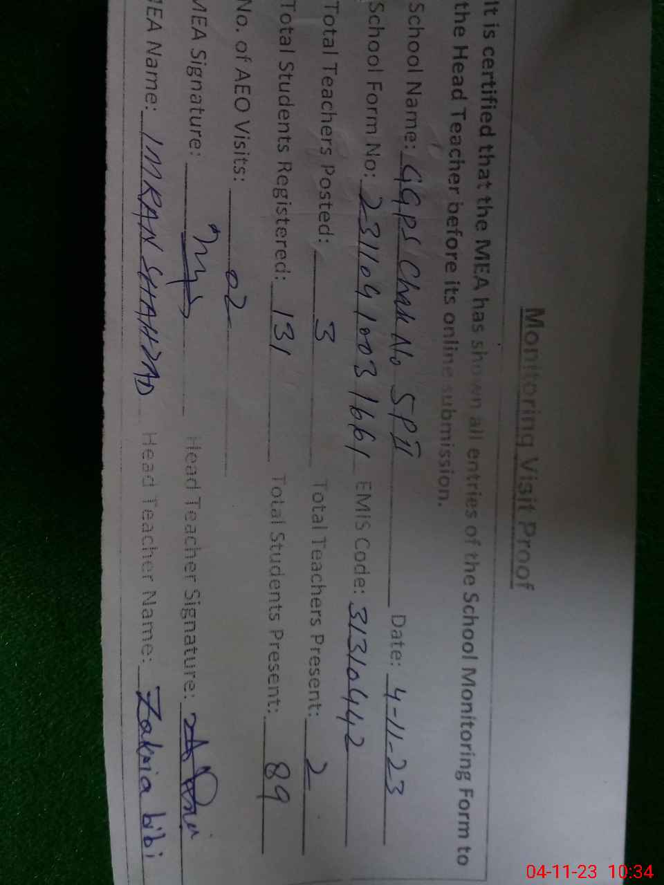 | Attendance Register | Head Teacher | MEA with School | Visit Proof |
