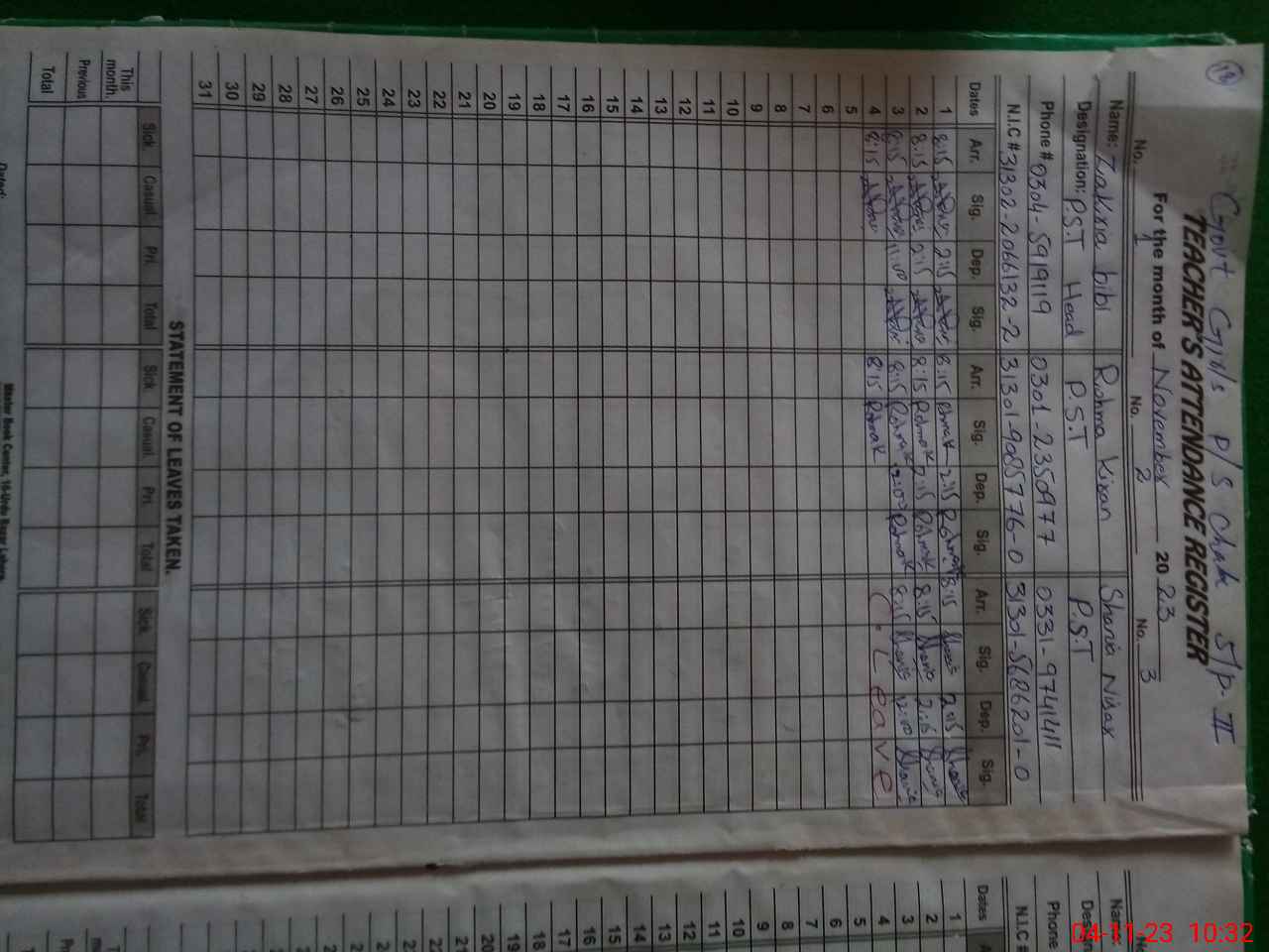 | Name: Zi**** Bi**** Designation: (School Headmaster's/Headmistress's) P S T Phone/Cell Number: 03**** |