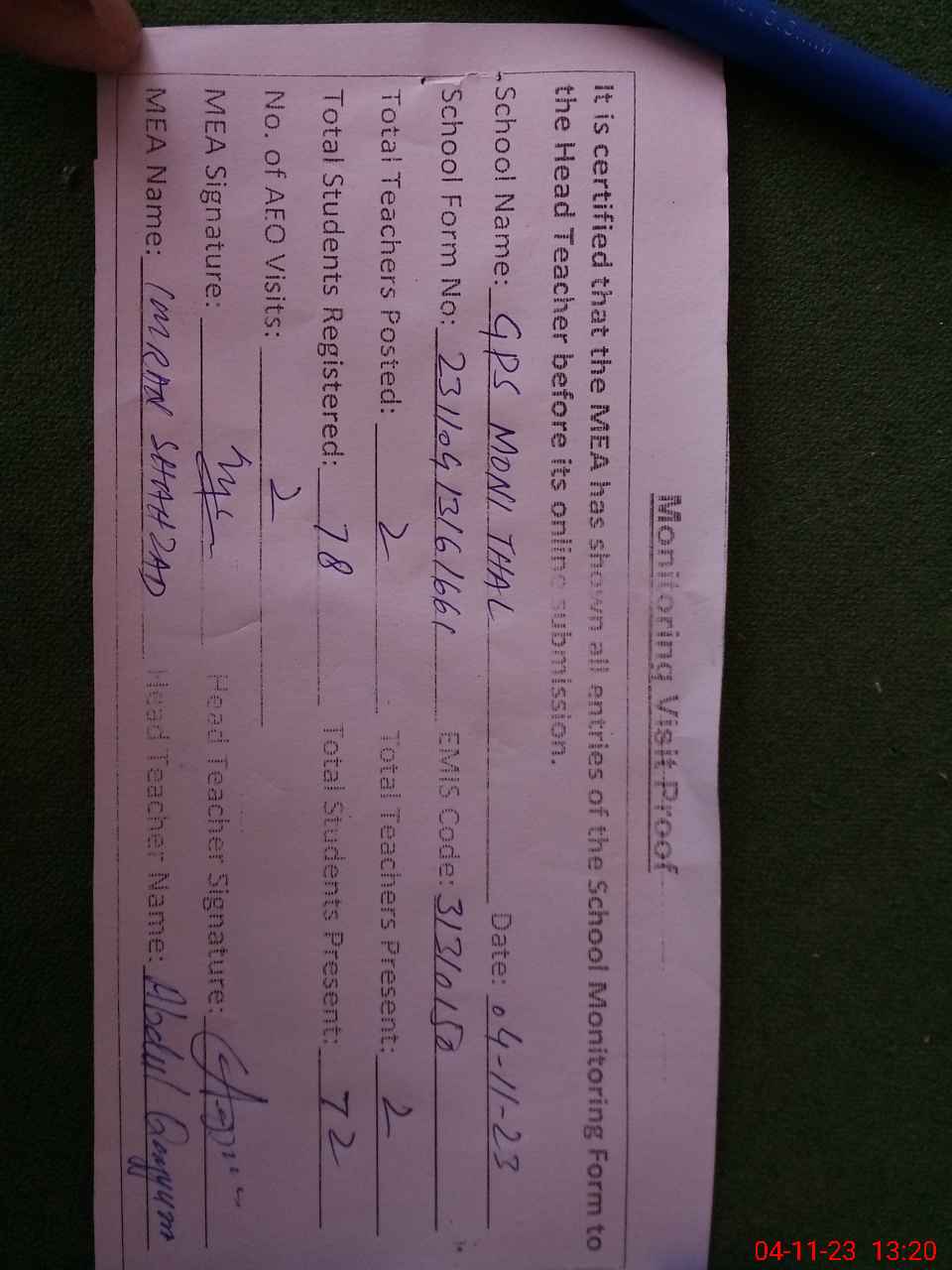 | Attendance Register | Head Teacher | MEA with School | Visit Proof |