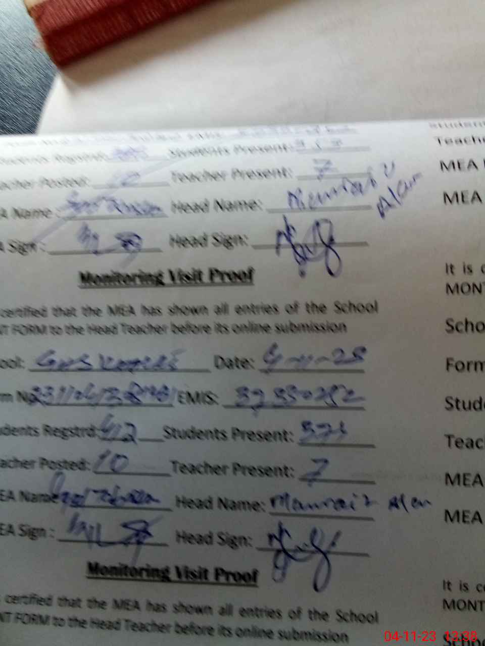 | Attendance Register | Head Teacher | MEA with School | Visit Proof |