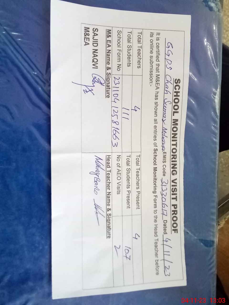 | Attendance Register | Head Teacher | MEA with School | Visit Proof |