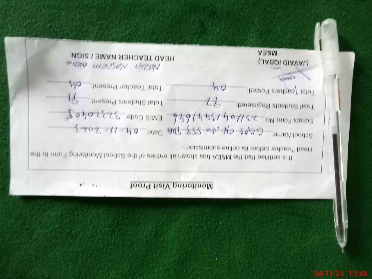 | Attendance Register | Head Teacher | MEA with School | Visit Proof |