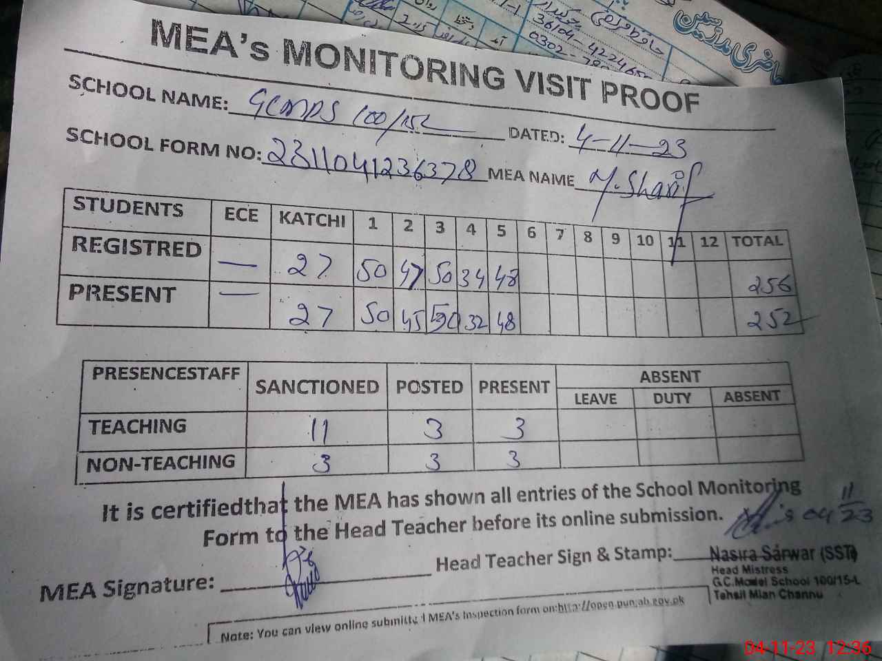 | Attendance Register | Head Teacher | MEA with School | Visit Proof |