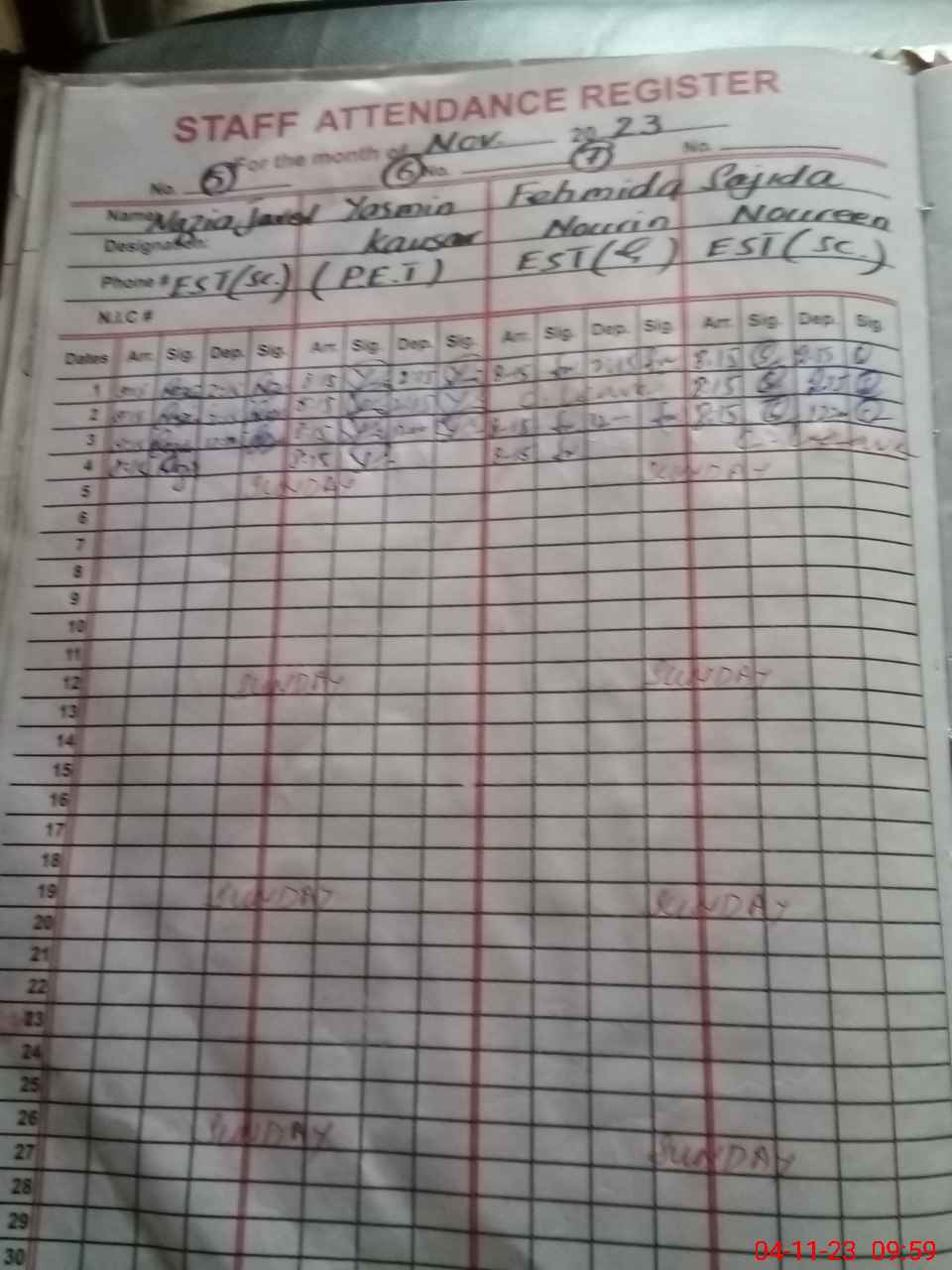 | Remarks (Use Separate Page if Required): NSB and FTF registers were not maintained for October 2023 Teacher Sajida Noureen EST attached from GGES 18 8R for last two months She was on casual leave | |||||