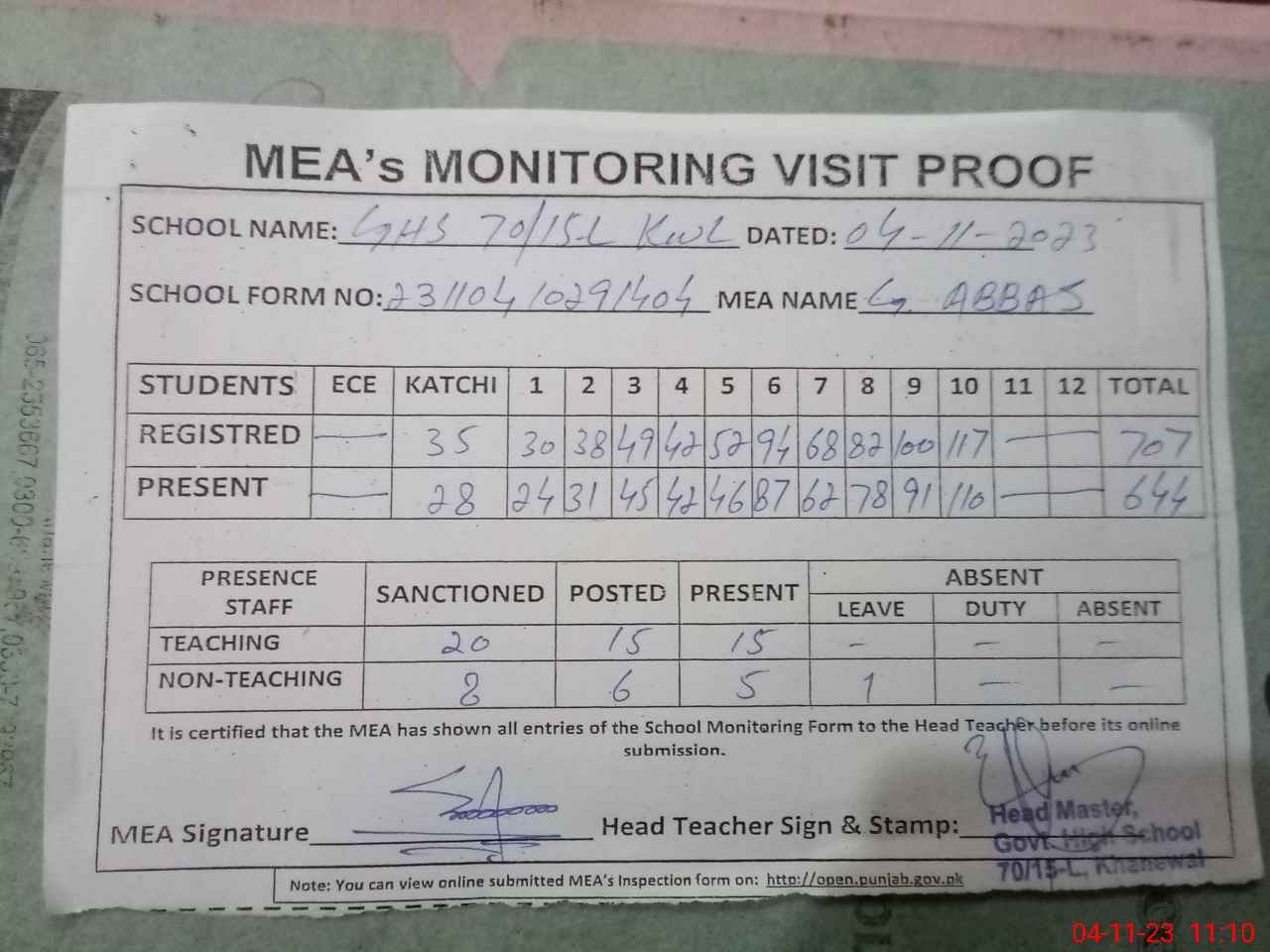 | Attendance Register | Head Teacher | MEA with School | Visit Proof |