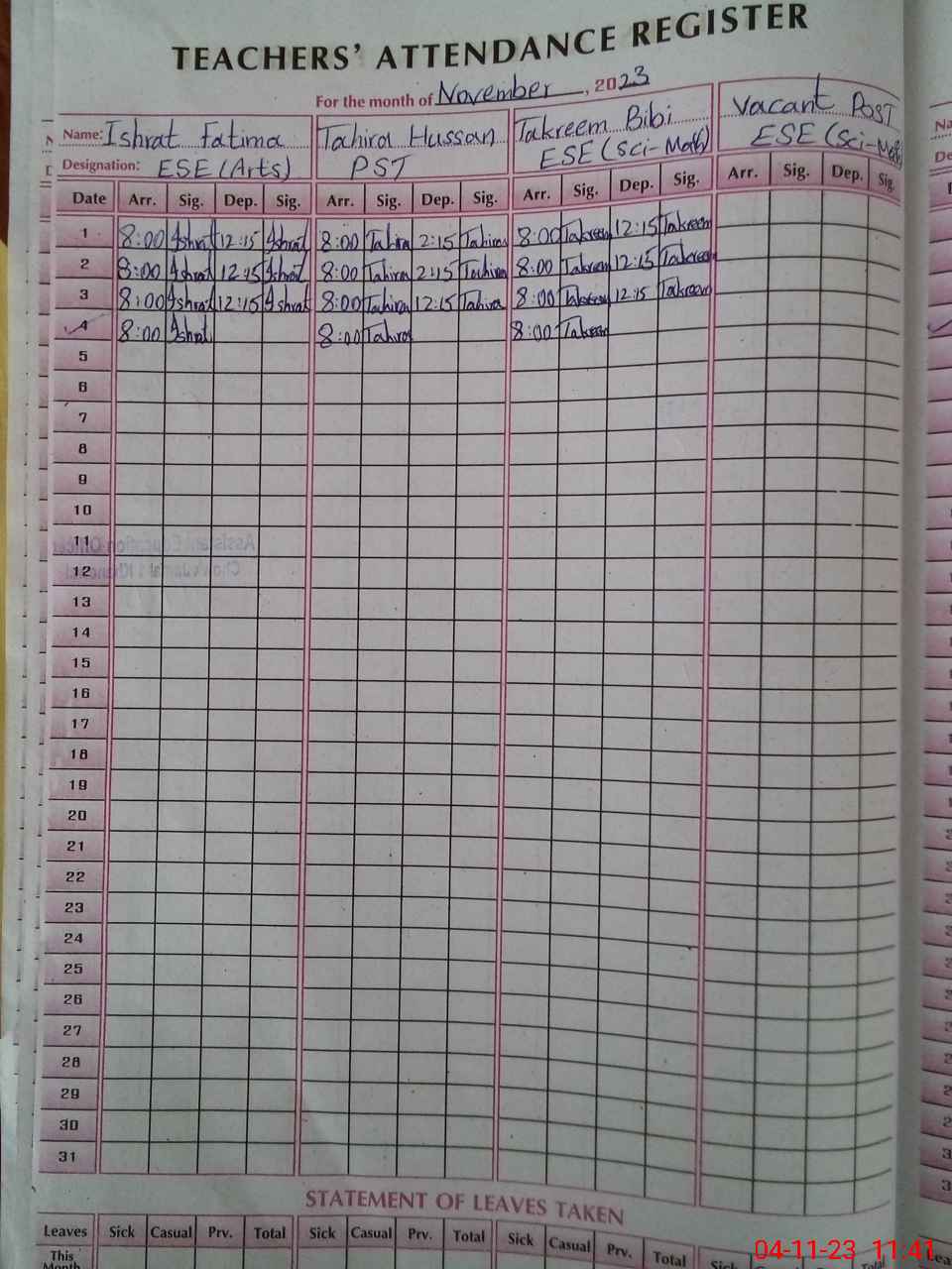 | Leave | Duty | Absent | Maternity | Medical | Ex- Pak |
