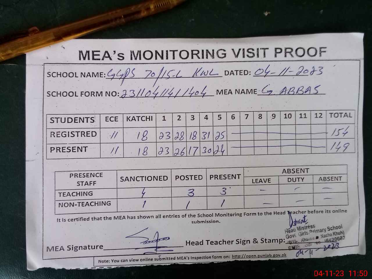 | Attendance Register | Head Teacher | MEA with School | Visit Proof |