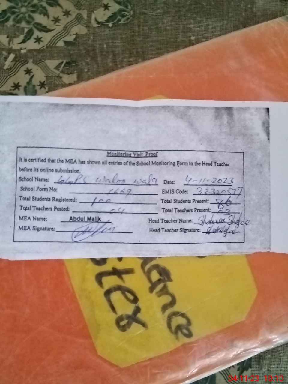 | Attendance Register | Head Teacher | MEA with School | Visit Proof |
