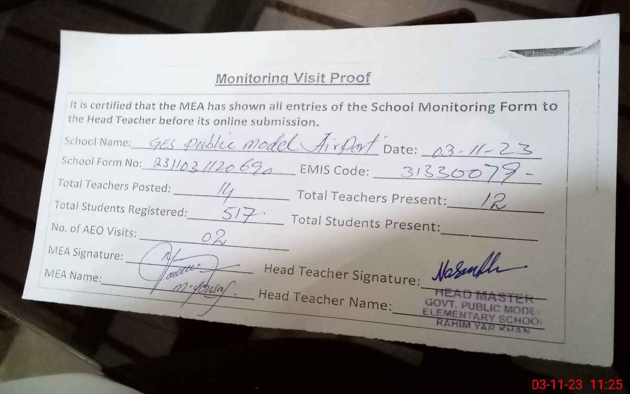 | Attendance Register | Head Teacher | MEA with School | Visit Proof |