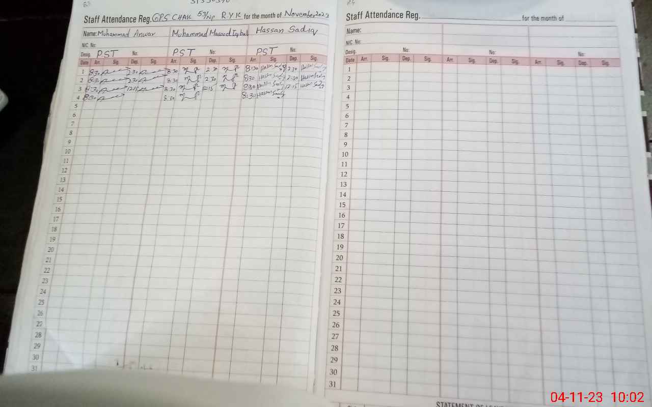 | CNIC | Full Name | Designation | R/C | Absence During Last Calender Month |