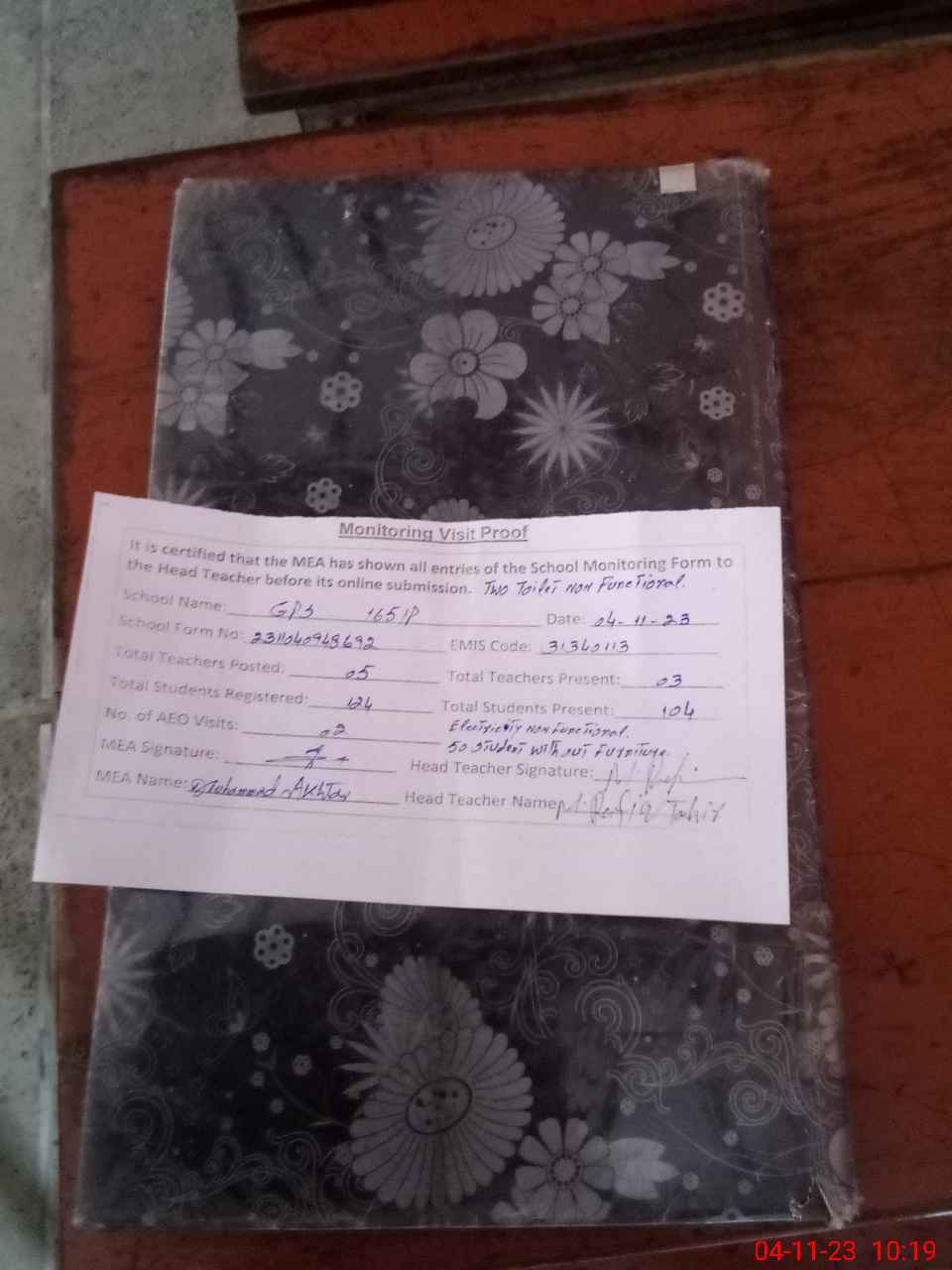 | Attendance Register | Head Teacher | MEA with School | Visit Proof |