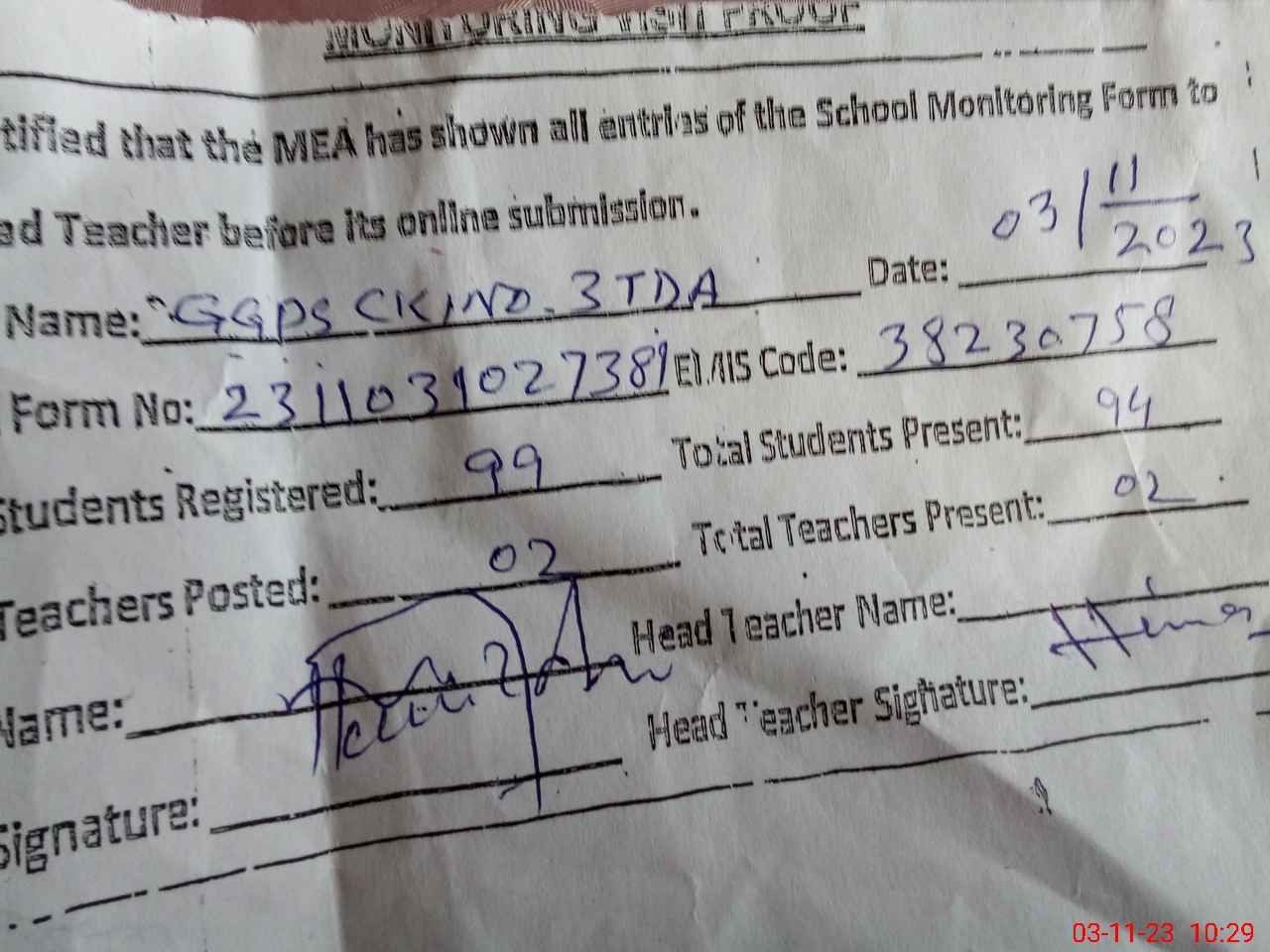 | Attendance Register | Head Teacher | MEA with School | Visit Proof |