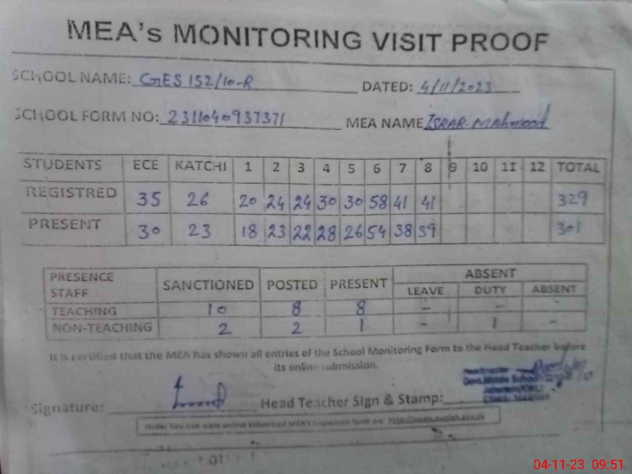 | Attendance Register | Head Teacher | MEA with School | Visit Proof |