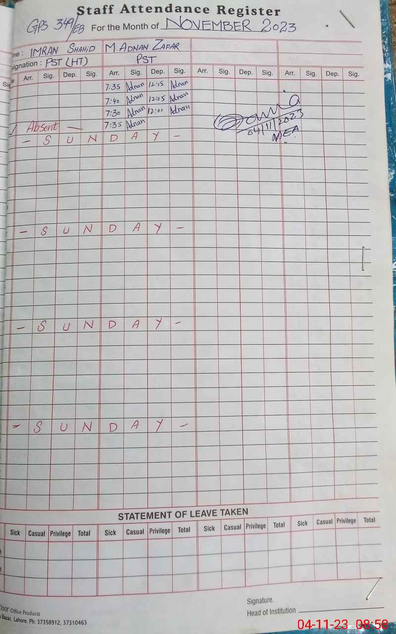 | Remarks (Use Separate Page if Required): Note H T Teacher Imran Shahid PST found ABSENT from his duty since October 9 2023 | |||||