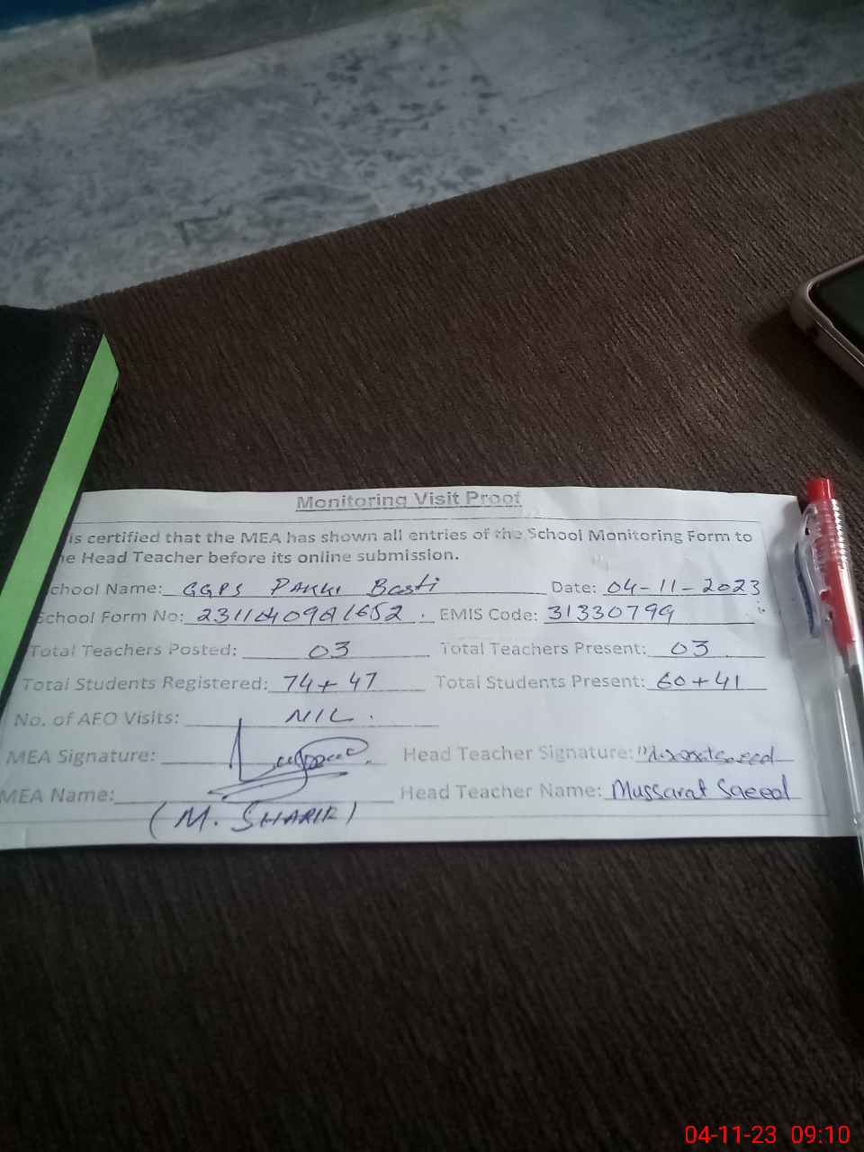 | Attendance Register | Head Teacher | MEA with School | Visit Proof |