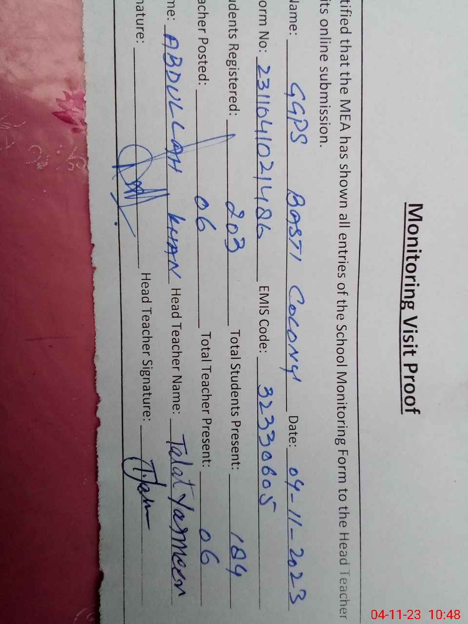 | Attendance Register | Head Teacher | MEA with School | Visit Proof |