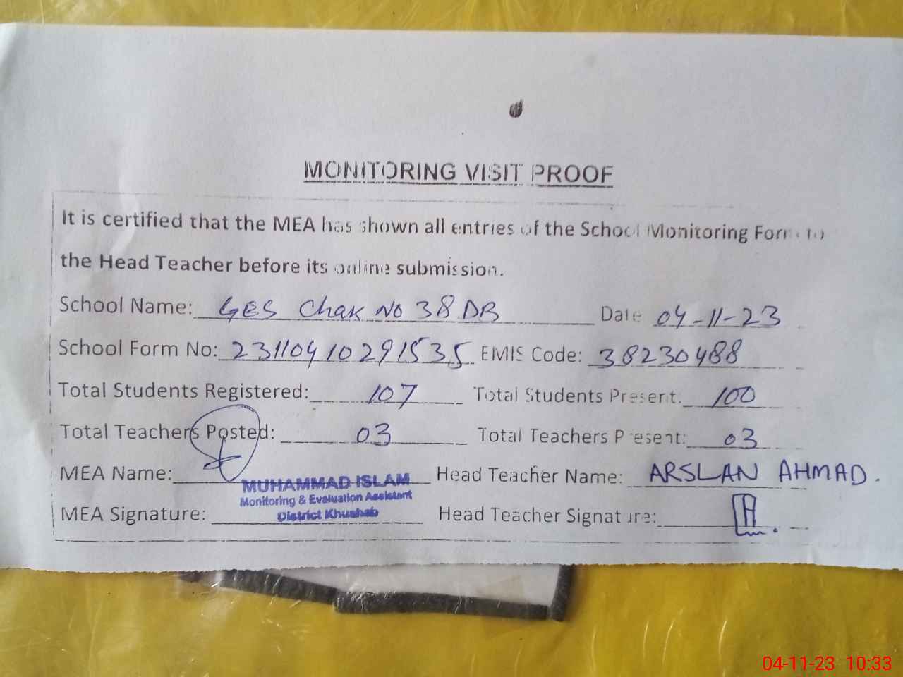 | EMIS Code: 38230488 | Name of School: GES CHAK NO. 38 DB | |||