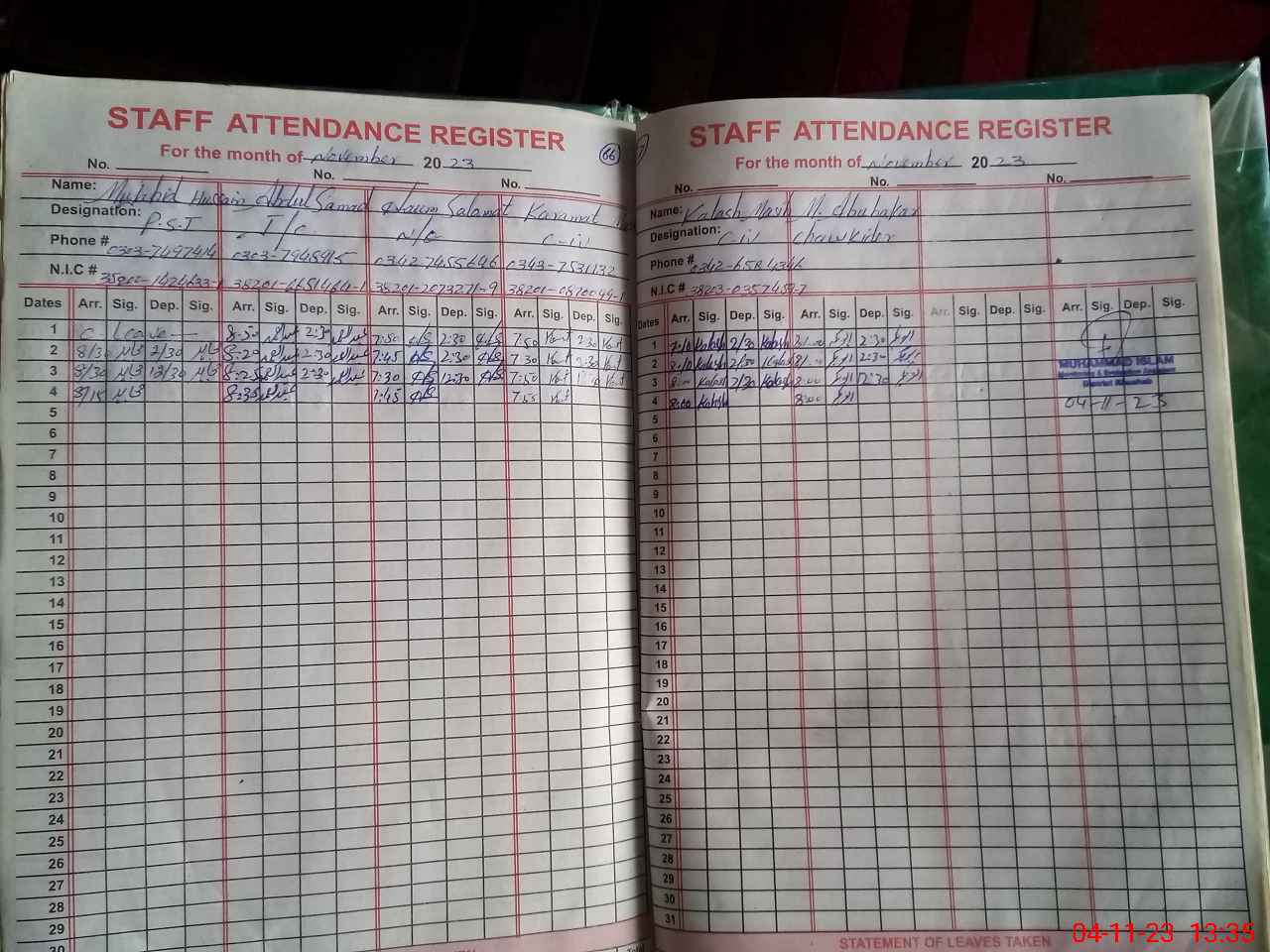| CNIC | Full Name | Designation | R/C | Absence During Last Calender Month |
