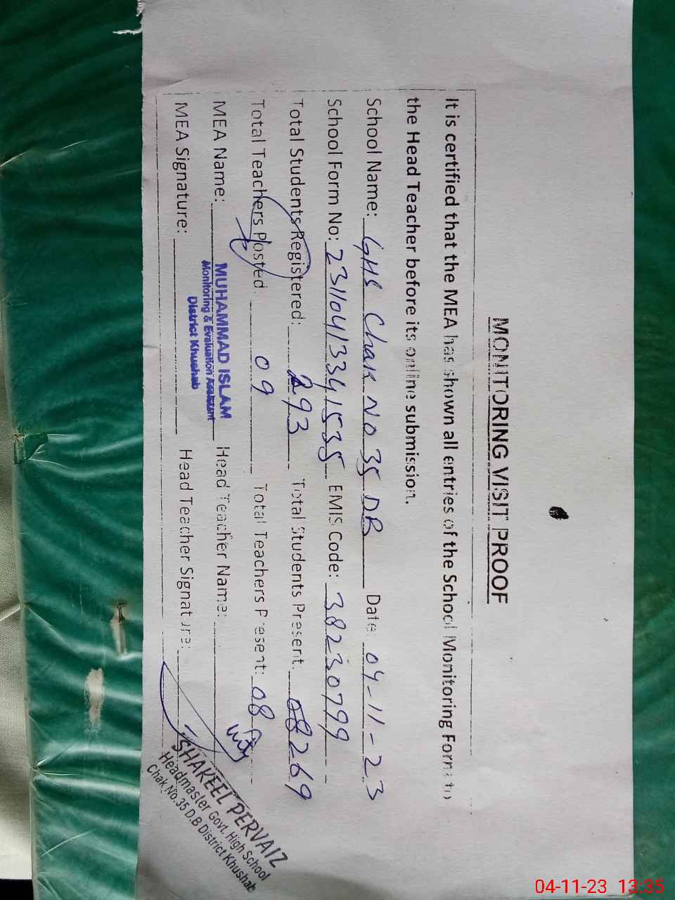 | EMIS Code: 38230799 | Name of School: GHS CHAK NO 35 DB | |||