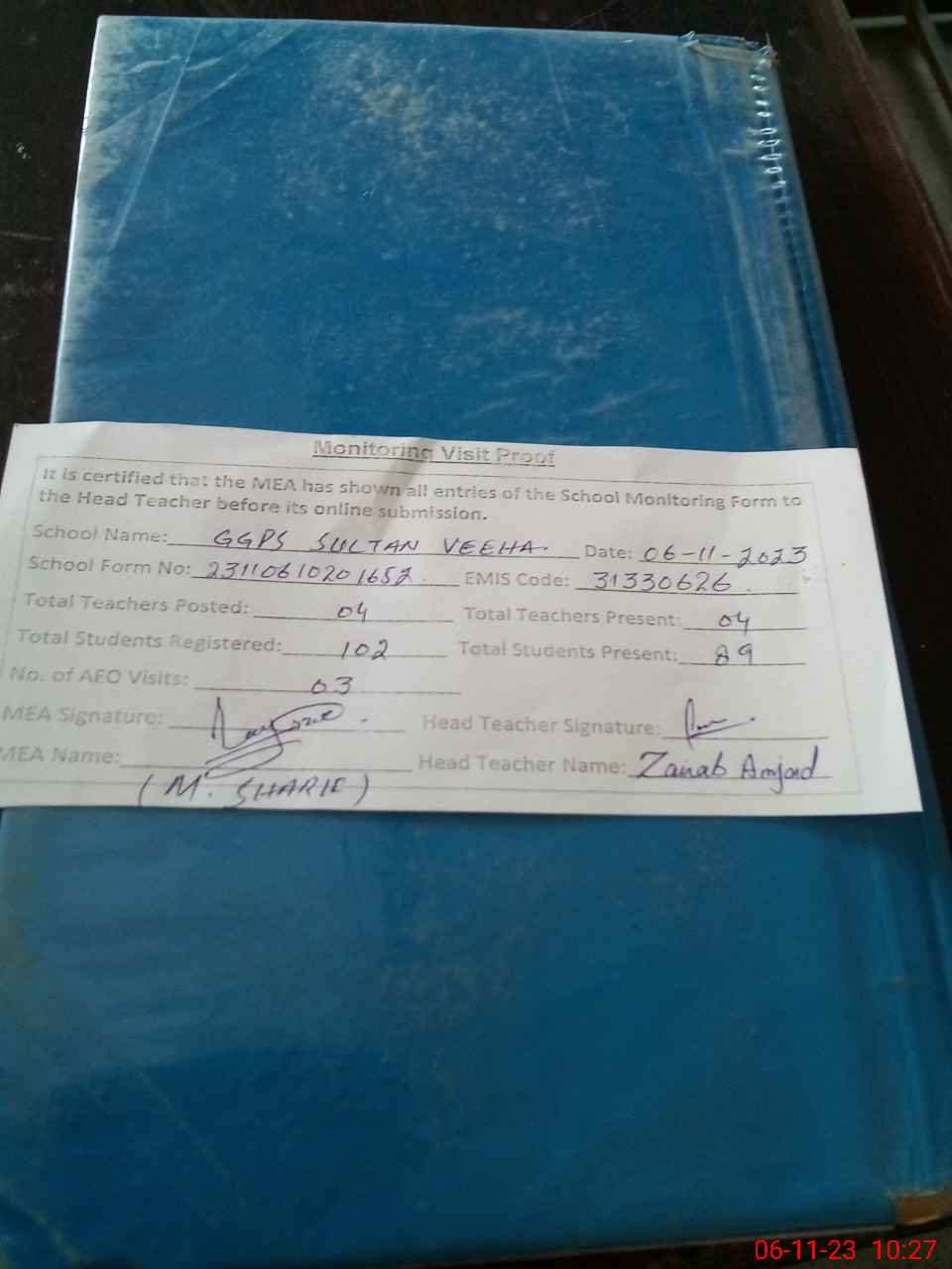| Attendance Register | Head Teacher | MEA with School | Visit Proof |