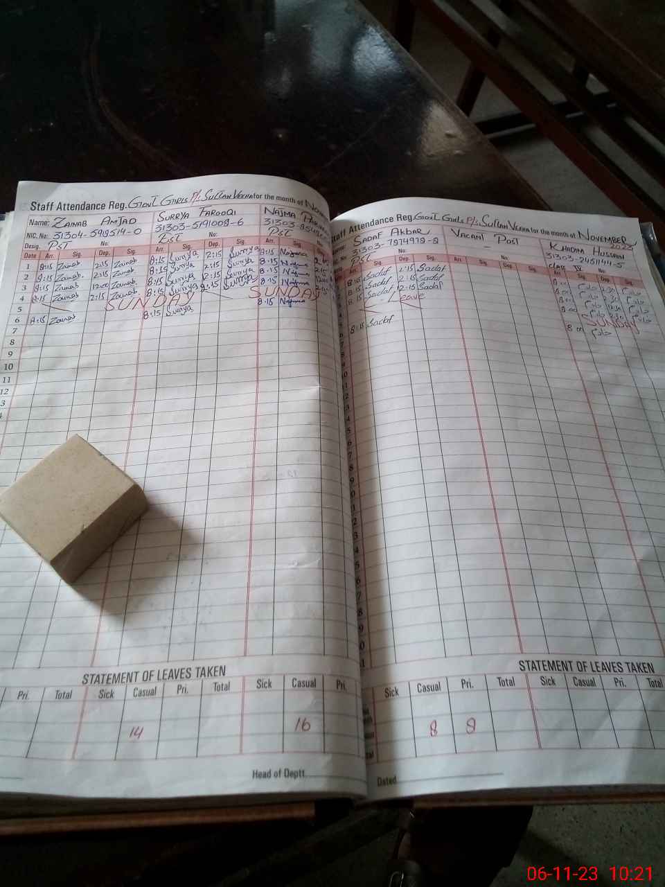 | CNIC | Full Name | Designation | R/C | Absence During Last Calender Month |