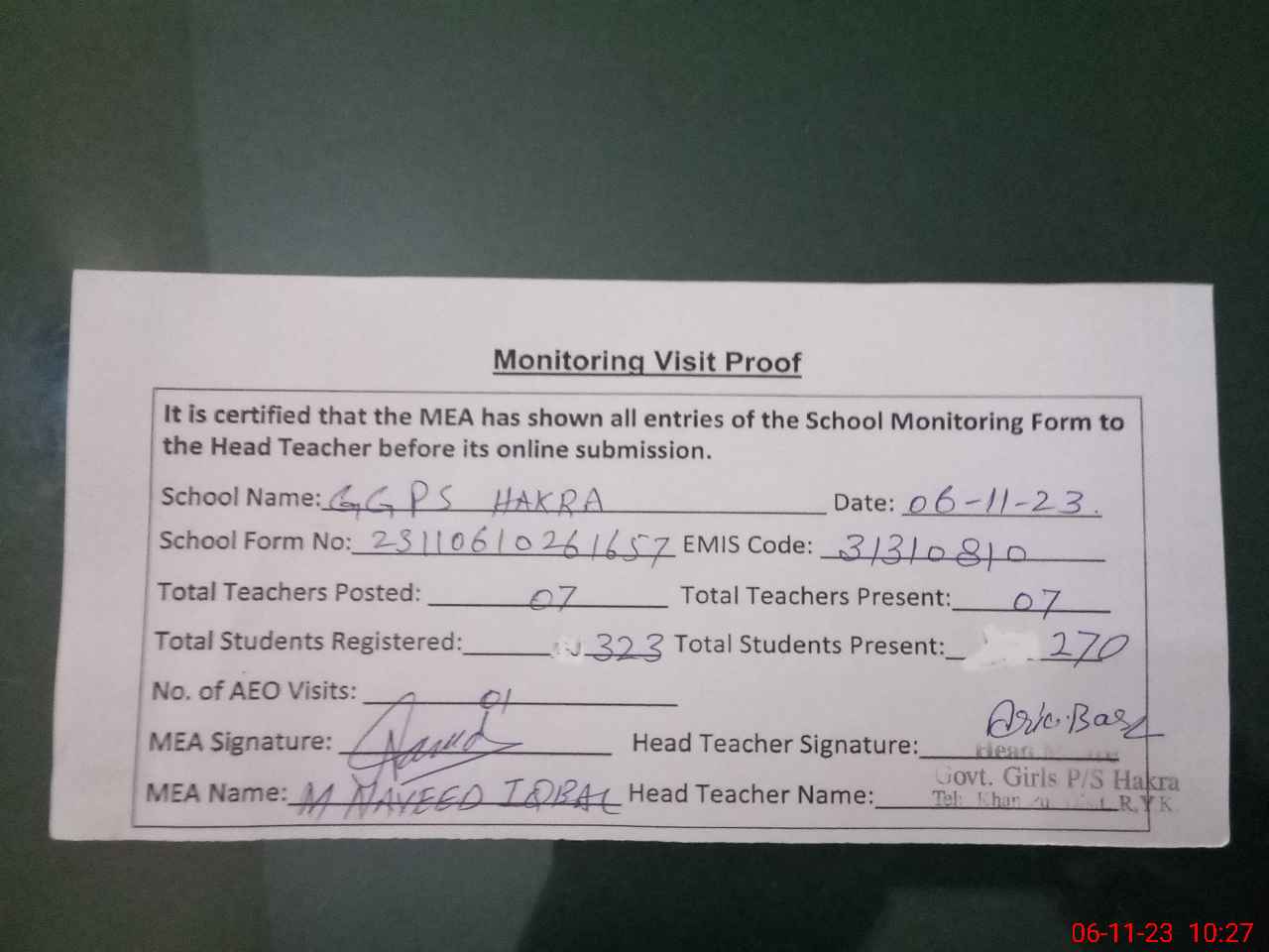 | Attendance Register | Head Teacher | MEA with School | Visit Proof |