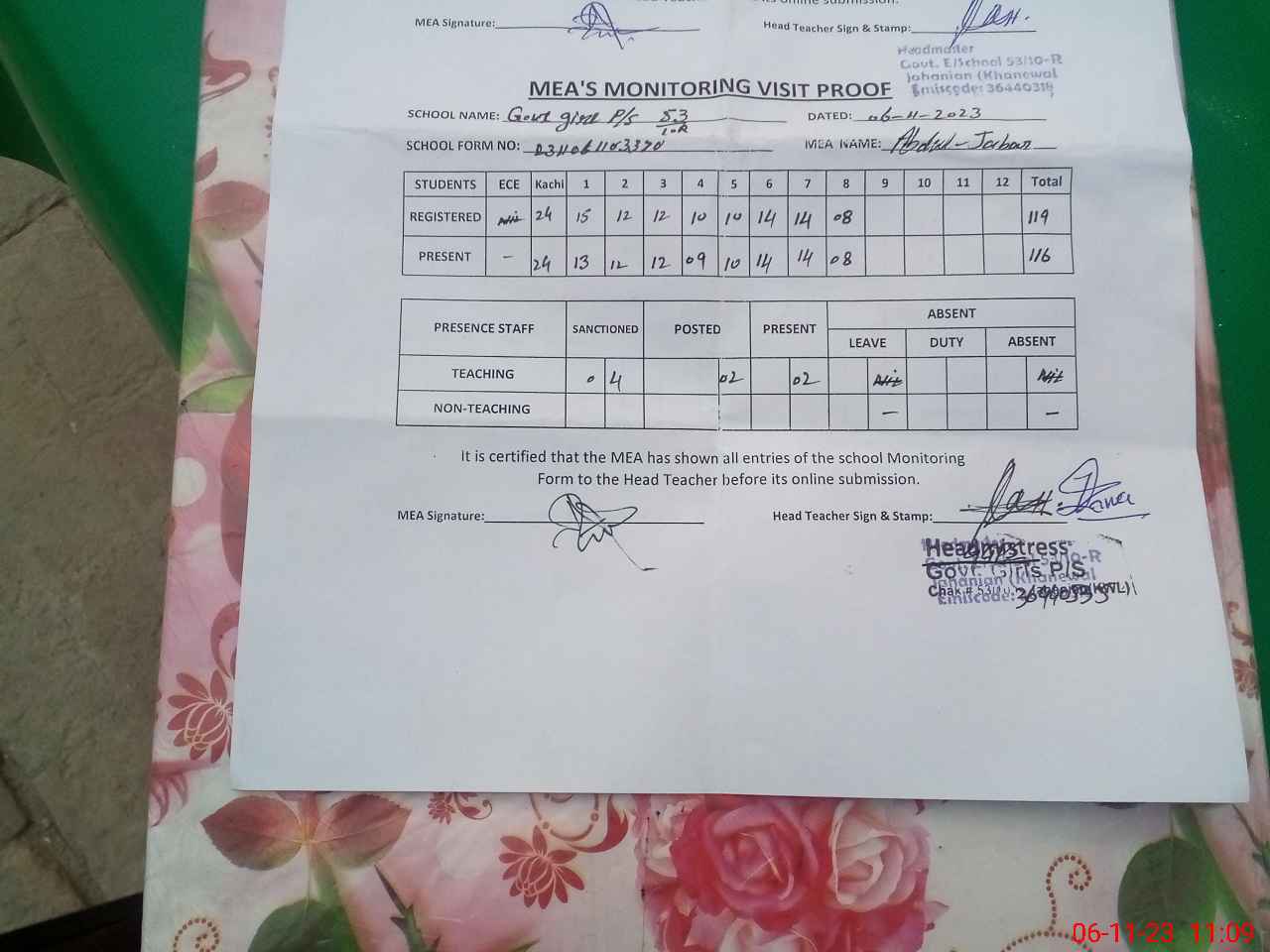 | Attendance Register | Head Teacher | MEA with School | Visit Proof |