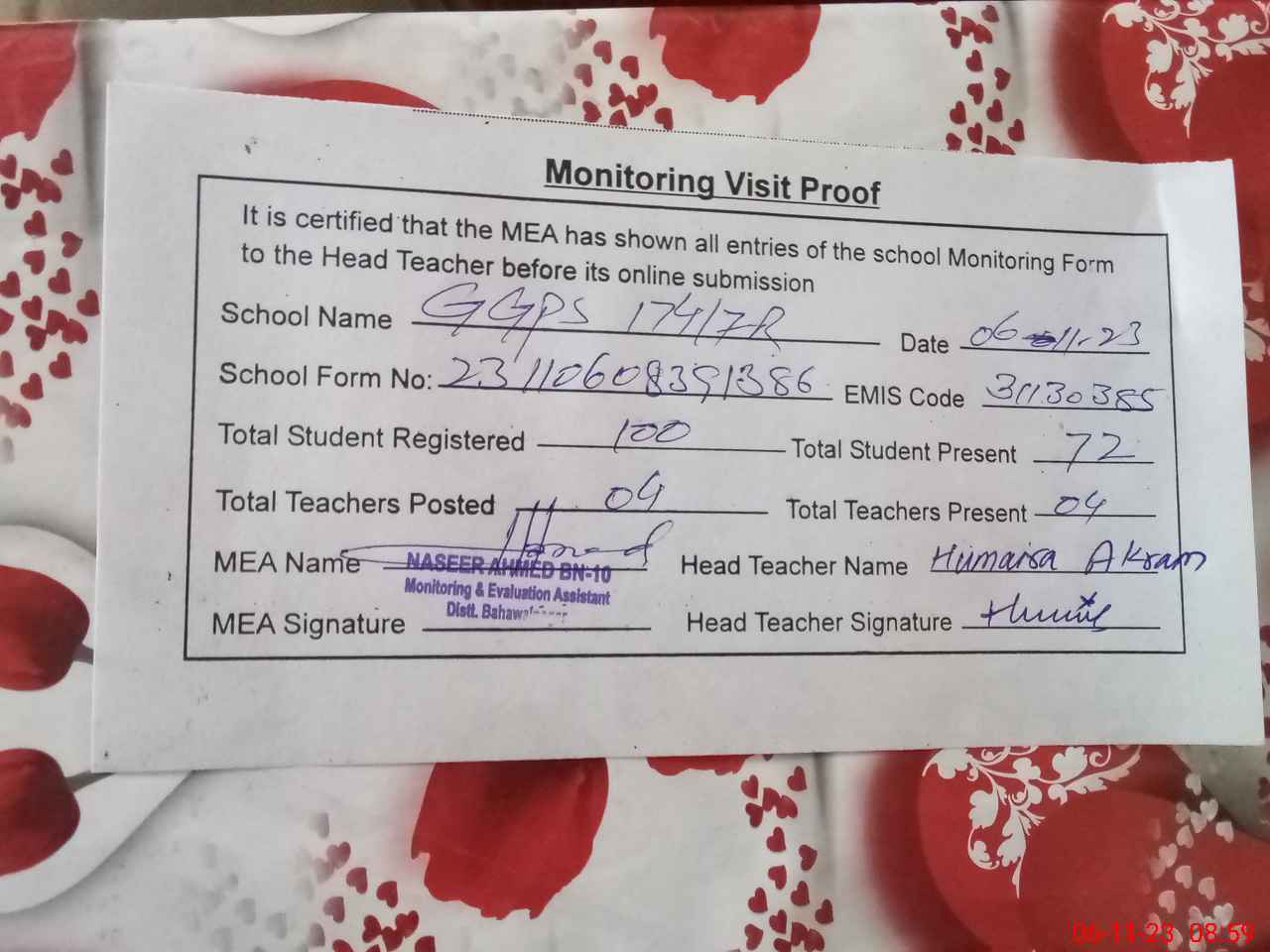 | EMIS Code: 31130385 | Name of School: GGPS CHAK NO 174/7-R | |||
