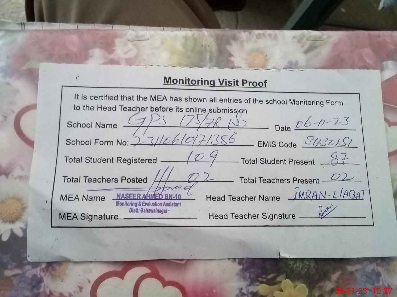 | EMIS Code: 31130151 | Name of School: GPS CHAK NO 175 7R SOUTH | |||