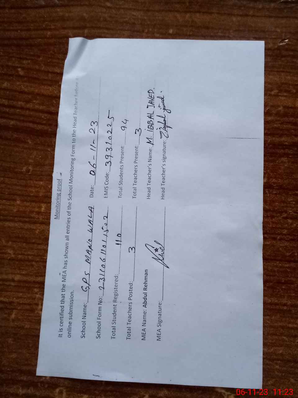 | Name: MU**** IQ**** JA**** Designation: (School Headmaster's/Headmistress's) EST V Phone/Cell Number: 03**** |