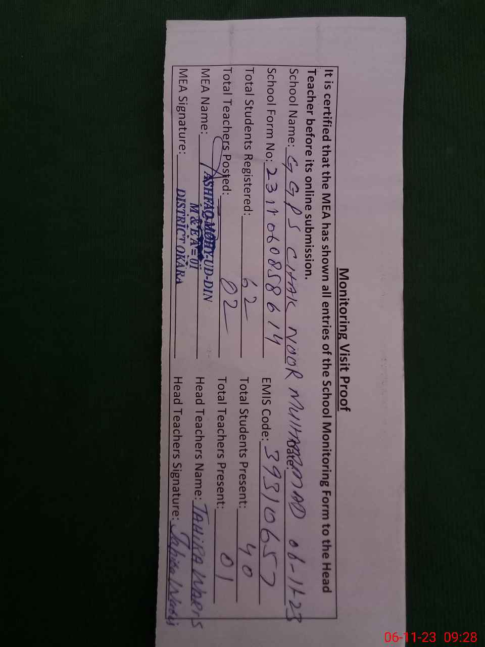 | EMIS Code: 39310657 | Name of School: GGPS NOOR MUHAMMAD | |||
