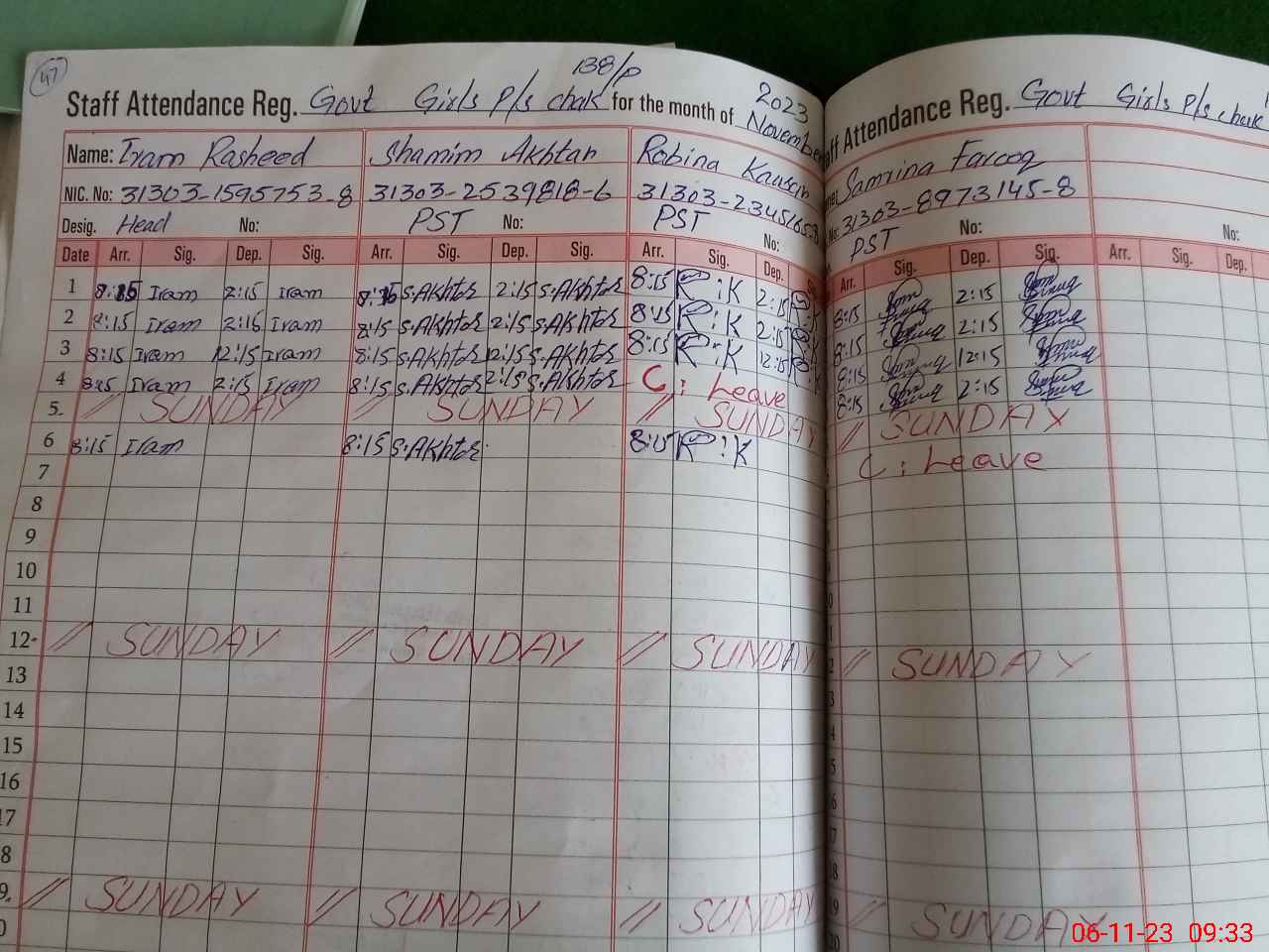 | CNIC | Full Name | Designation | R/C | Absence During Last Calender Month |